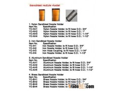 Nylon Sandblast Nozzle HolderItem No. Specification YC-NH1 Nylon Nozzle Holder, to fit hose O.D.: 3/4"YC-NH2 Nylon Nozzle Holder, to fit hose O.D.: 1"YC-NH3 Nylon Nozzle Holder, to fit hose O.D.: 1-1/4"YC-NH4 Nylon Nozzle Holder, to fit hose O.D.: 1-1/2"